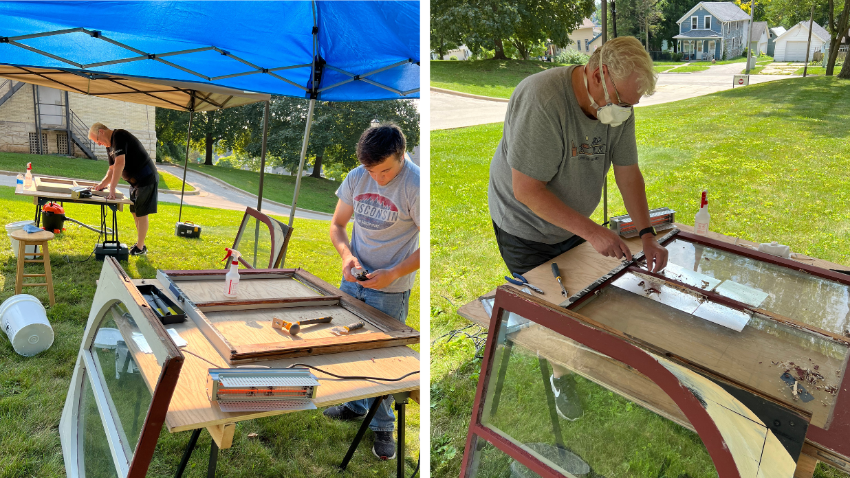Back at the Heritage Center, window sashes are cleaned and prepped. Glass panes are carefully removed while layers of paint are scraped off.
