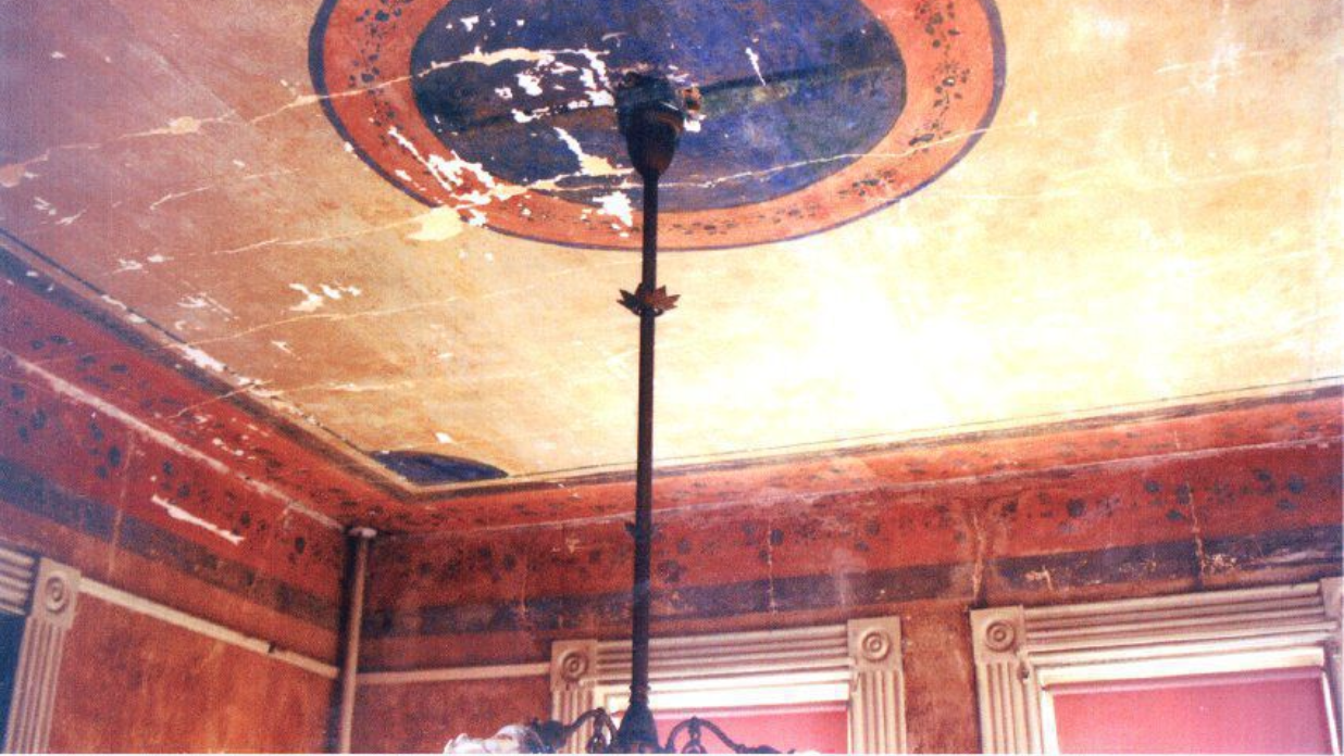 In 2002, this image details the ceiling decoration on the front parlor’s plaster ceiling. The design has been replicated, mirroring a similar effect in the space today.